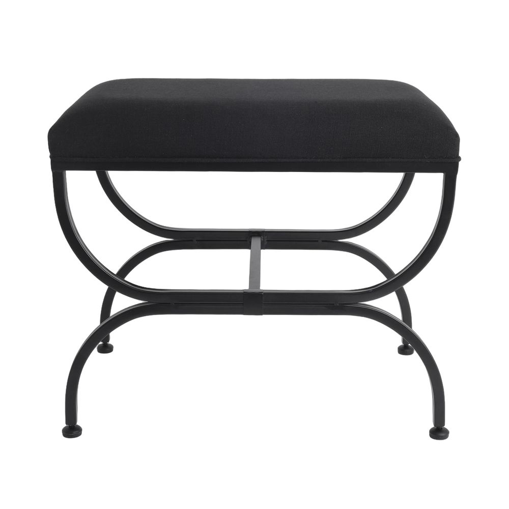 Elevate your space with this modern black upholstered bench stool, designed to blend comfort with architectural style. Featuring a generously padded seat in smooth black fabric, it offers supportive seating with a refined tailored finish. The sculptural matte black metal frame showcases elegant curved legs and a central support bar for added stability and durability. Compact yet statement-worthy, this versatile bench is ideal for bedrooms, entryways or dressing areas, delivering contemporary sophistication and everyday functionality in one timeless design.