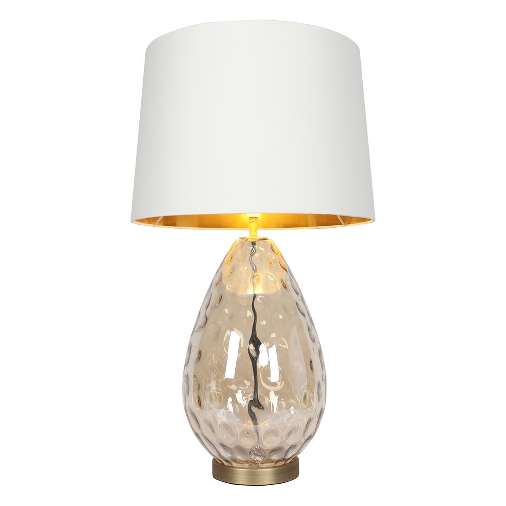 The Mabel Table Lamp brings a soft, sculptural elegance to your space with its gracefully rounded glass base and warm antique brass detailing. Featuring a subtly textured, translucent finish, the base gently diffuses light to create a warm ambient glow. Paired with a classic drum shade lined in a rich metallic interior, it enhances light reflection while adding a refined contrast. The timeless silhouette of the Mabel Table Lamp sits comfortably within both contemporary and classic interiors, offering a sophisticated yet versatile lighting solution.
