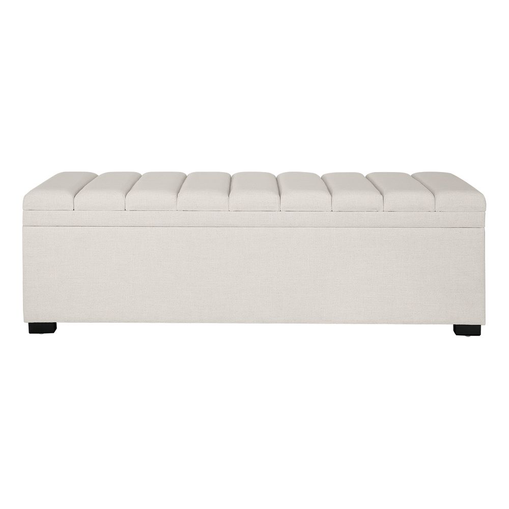 Upholstered in a classic off white linen blend fabric, the Soho storage bench ottoman features a luxuriously panelled top which lifts to reveal ample storage - creating a furniture piece that is both elegant and functional. Classic contemporary in design, the Soho storage bench ottoman is the perfect accent piece for a stylish bedroom, entry or additional living room seating. A beautiful complement to any interior.